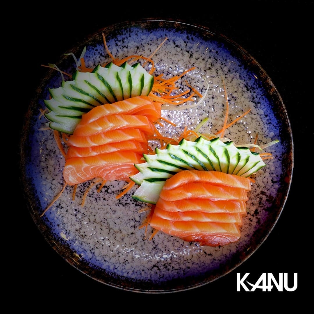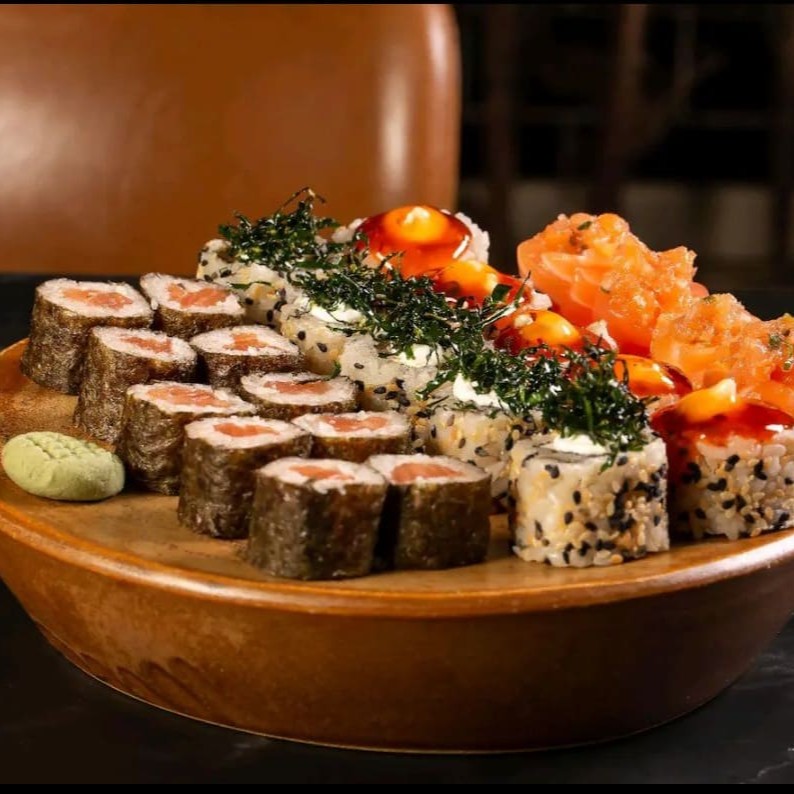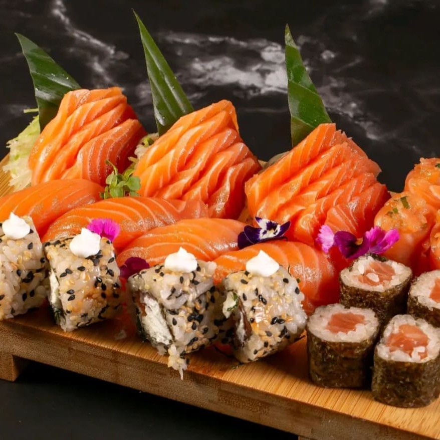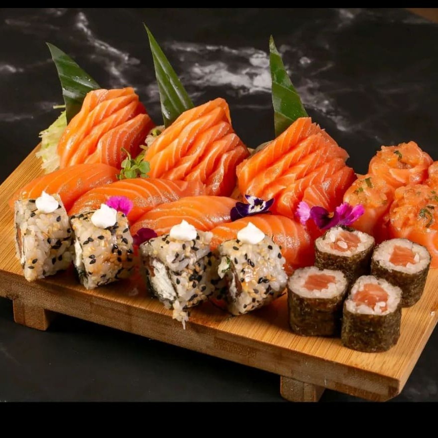 10 sashimis de salmão, 10 niguiris de salmão, 4 joy de salmão, 4 hossomakis de salmão, 4 uramakis de salmão.