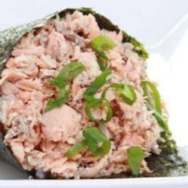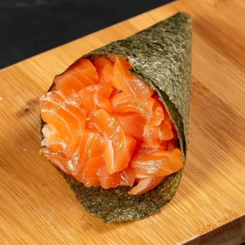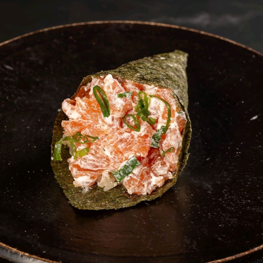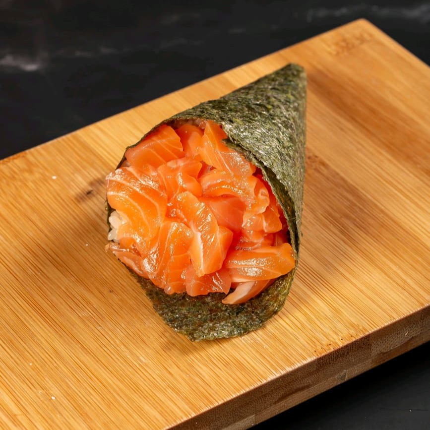 Temaki com 80g de salmão grelhado, cream cheese e cebolinha, combinando sabor marcante, cremosidade e frescor.