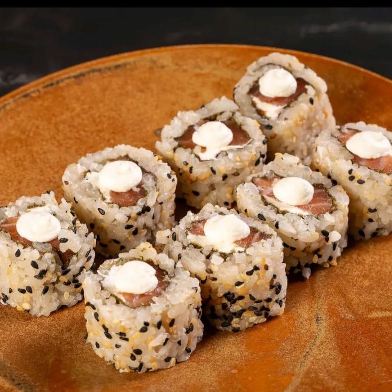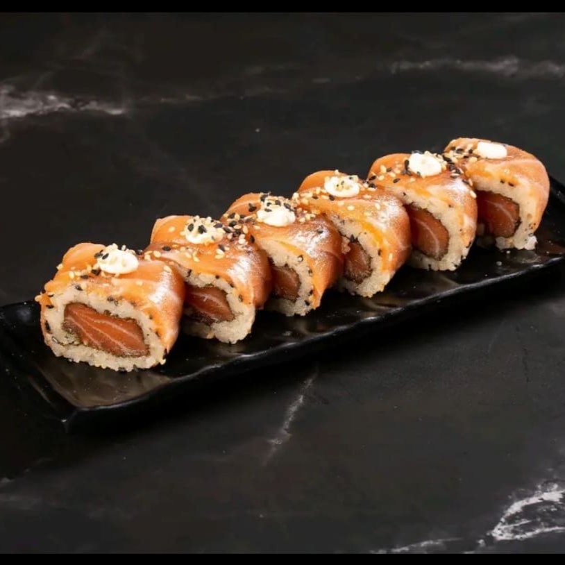 Uramaki recheado e coberto com salmão fresco e cream cheese,e gergelim.
