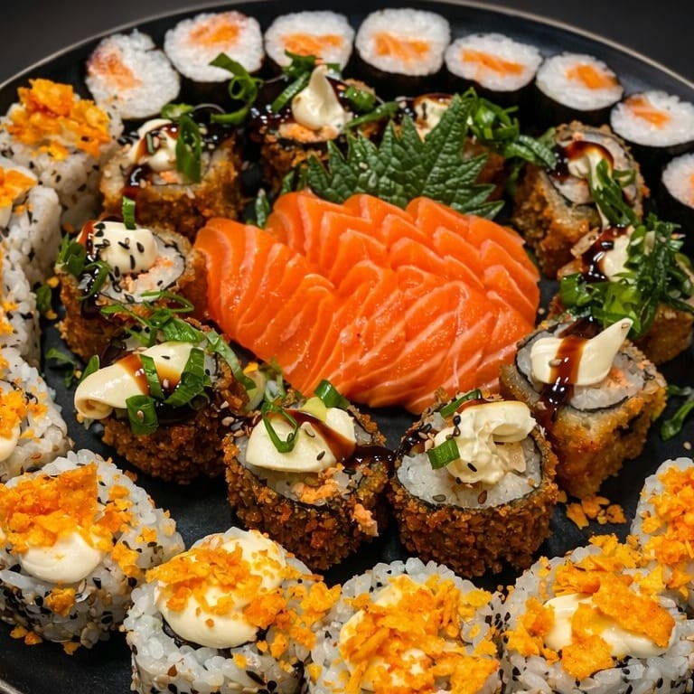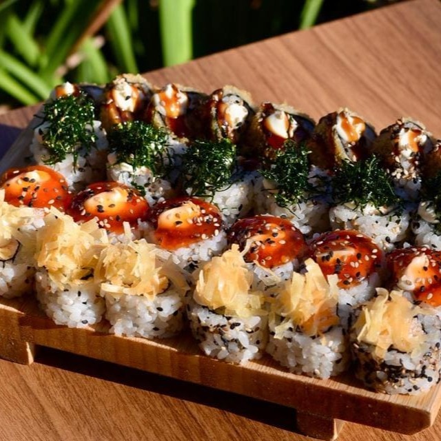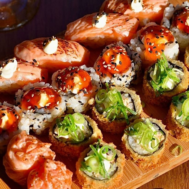 10 hot holls, 10 uramakis de salmão grelhado com geleia de pimenta, 15 hossomakis de salmão e 5 joys de salmão.