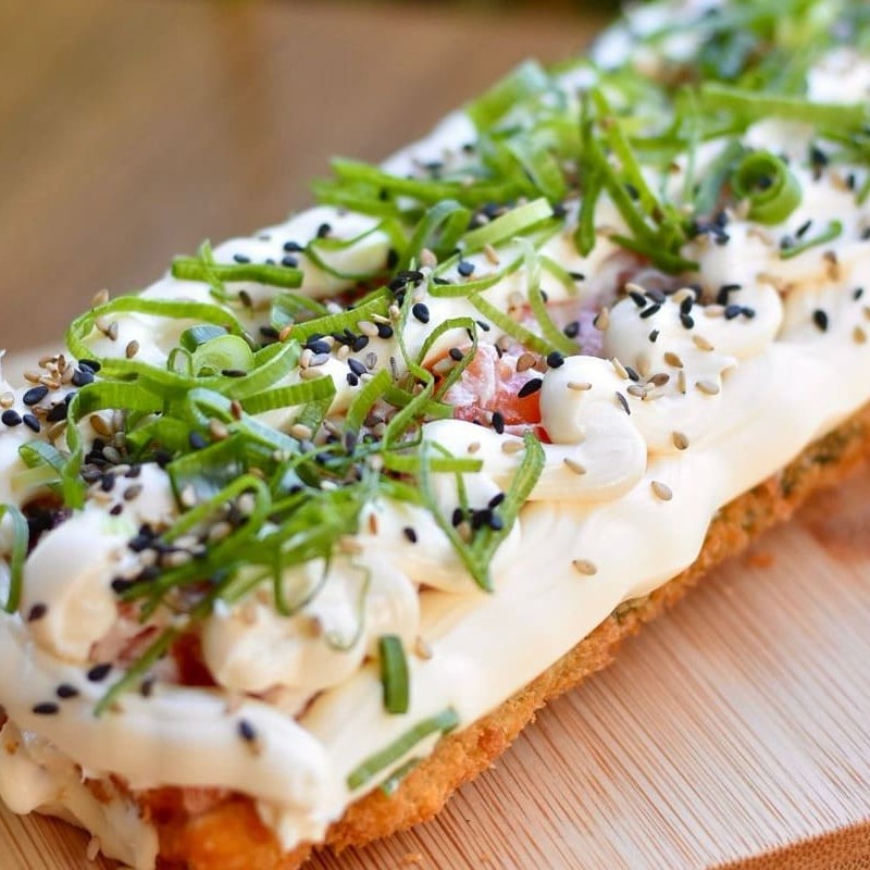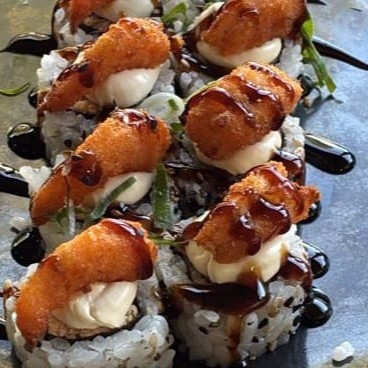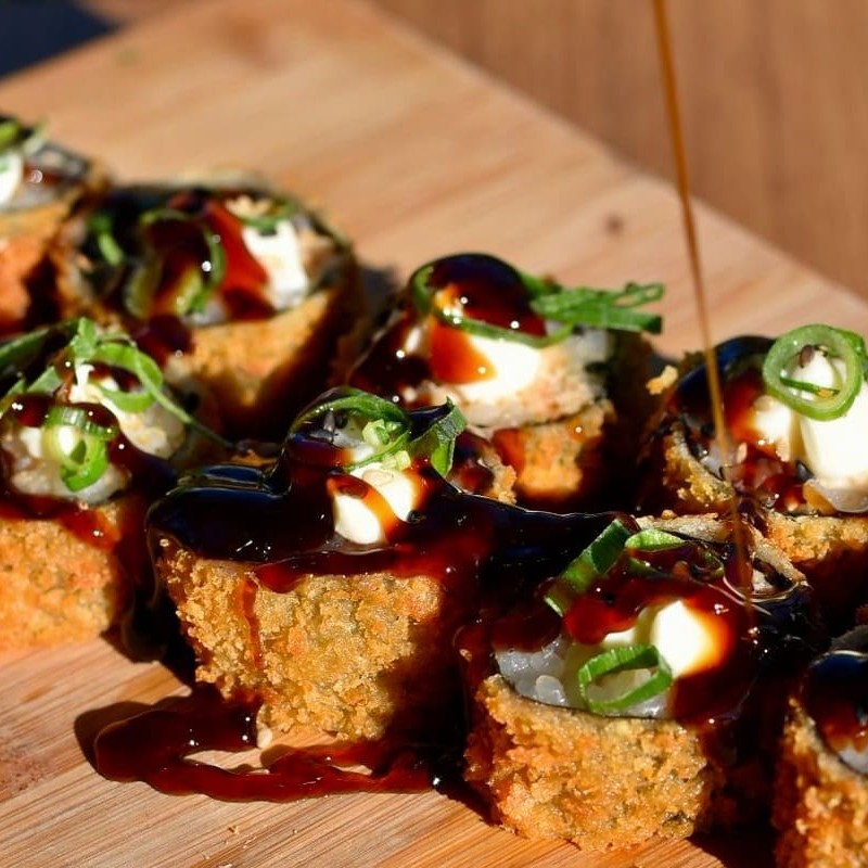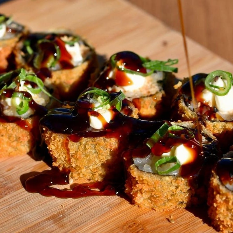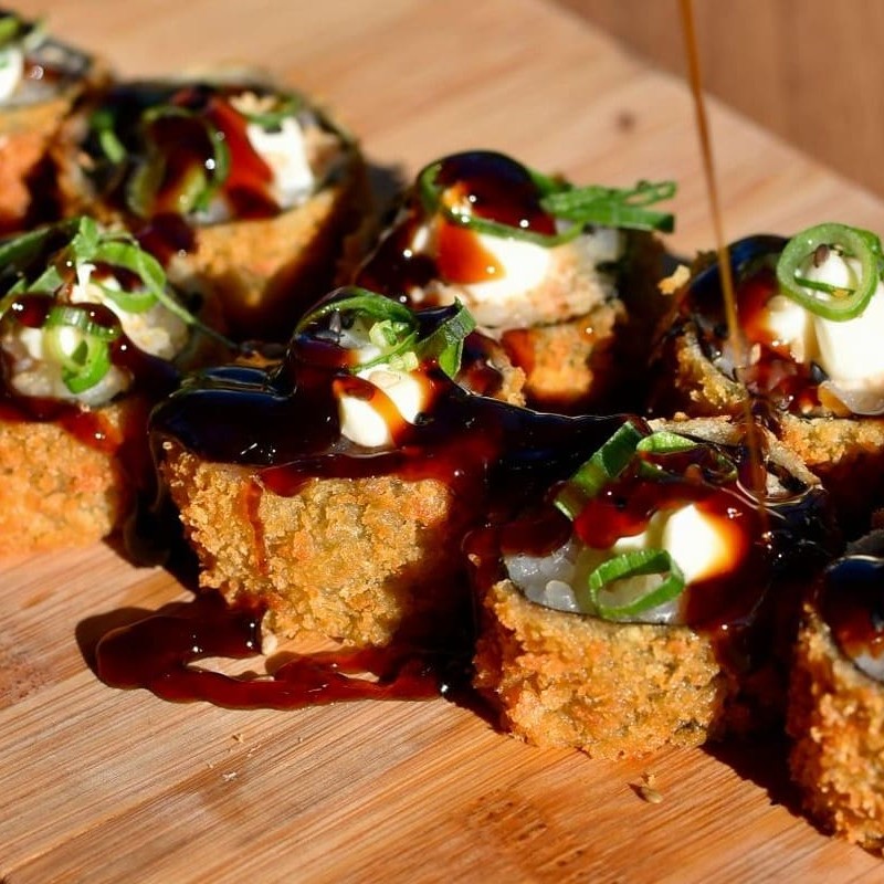 Sushi empanado ,crocante por fora e macio por dentro ,com salmão e molho tare.