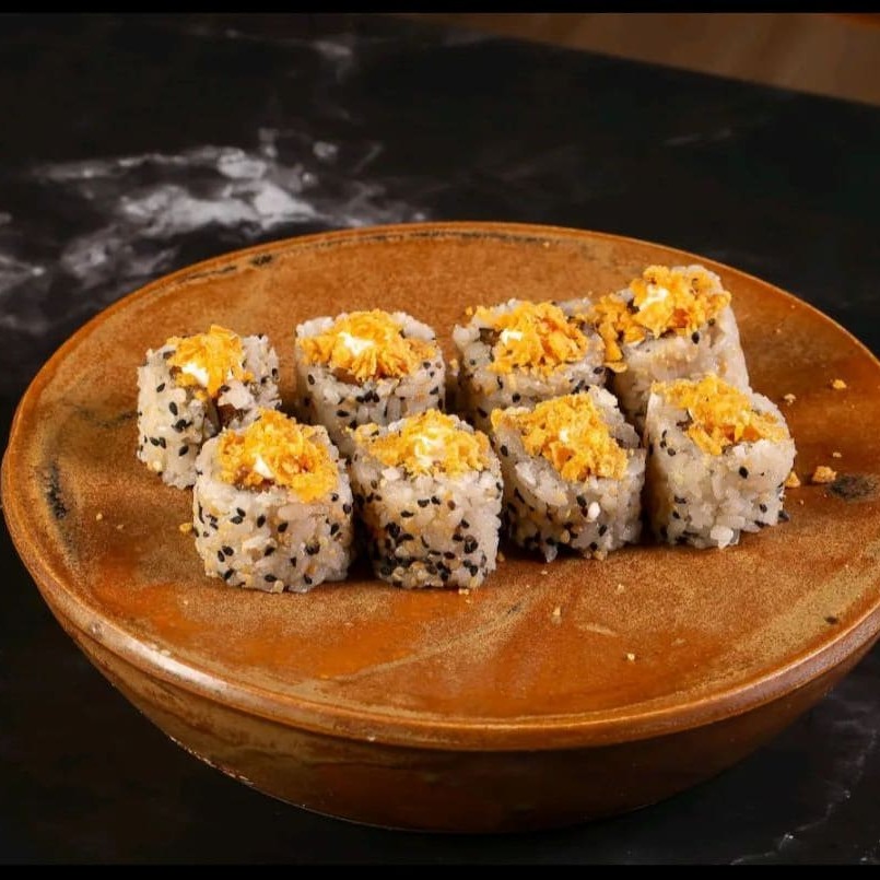 Uramaki recheado com salmão fresco e cream cheese, enrolado no arroz e alga;finalizado com Doritos.