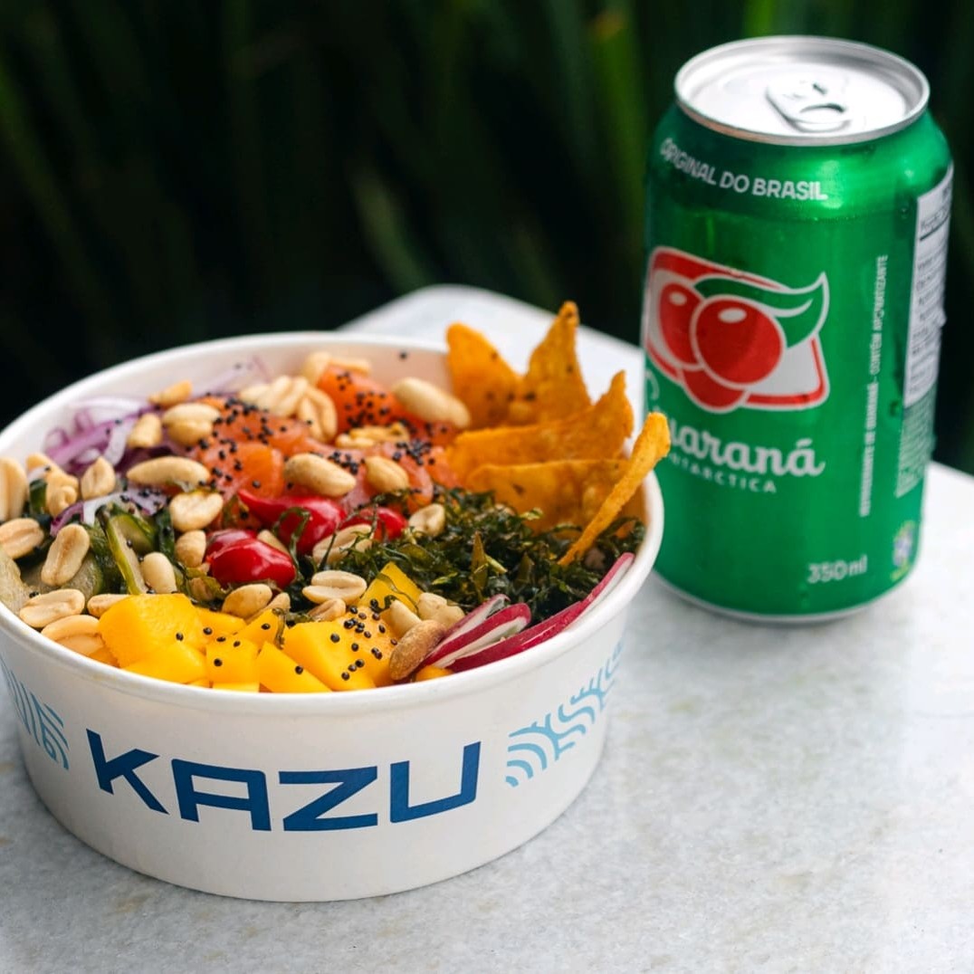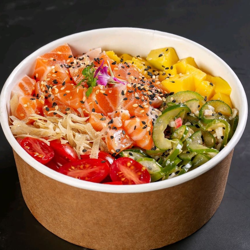 Poke de 70g de salmão fresco, acompanhado de sunomono com manga, tomate cereja e cebola roxa, mais 1 refrigerante à escolha (Coca-Cola ou Guaraná).