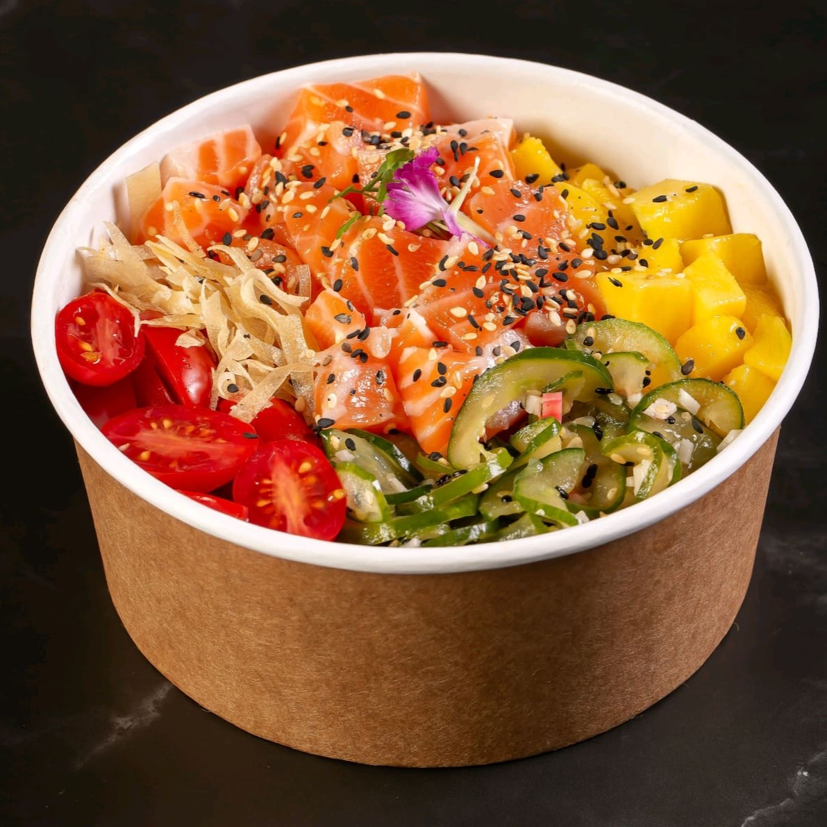 Delicioso com sunomono ,60g de salmão fresco, 250g de arroz shari, manga, pepino crocante, cebola roxa e tomate cereja — leve, refrescante e perfeito para qualquer momento.