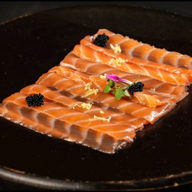 10 fatias finas de salmão, finalizado com azeite trufado e raspa de limão siciliano.