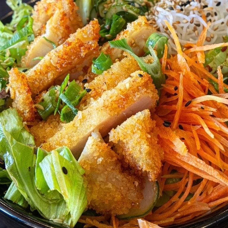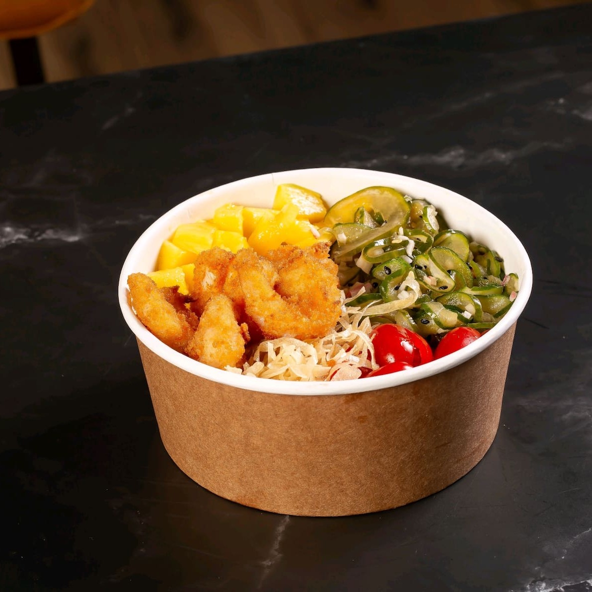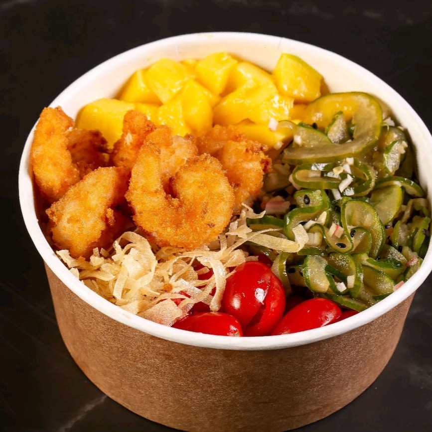 Poke de frango à milanesa com 100g de filé crocante, acompanhado de sunomono com manga, tomate cereja e cebola roxa, finalizado com molho especial da casa.