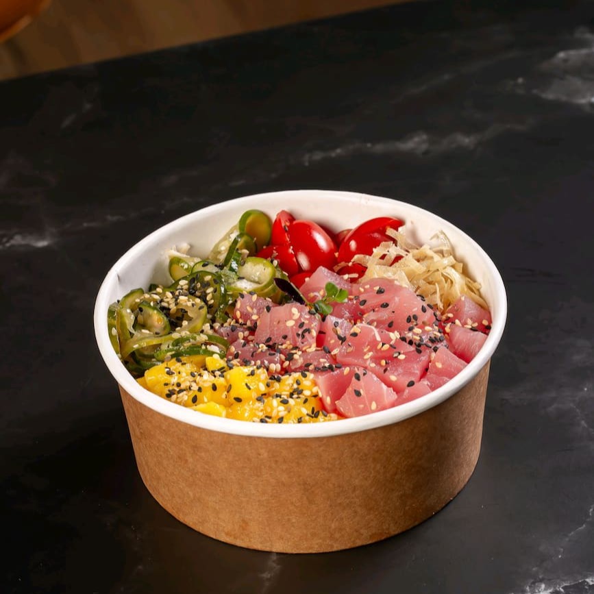 Delicioso poke de atum com aprox. 500g, combinando atum fresco em cubos, arroz japonês, manga, pepino japonês, cebola roxa e tomate, trazendo frescor, leveza e muito sabor.