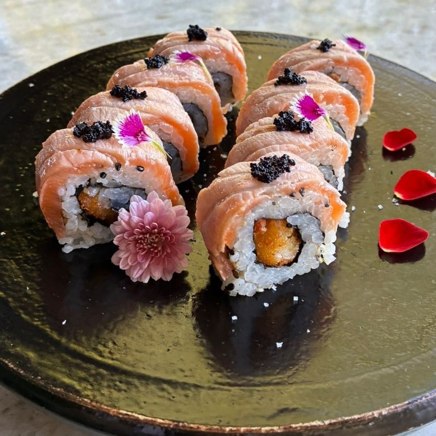 Uramaki de salmão grelhado com camarão,finalizado com molho especial.