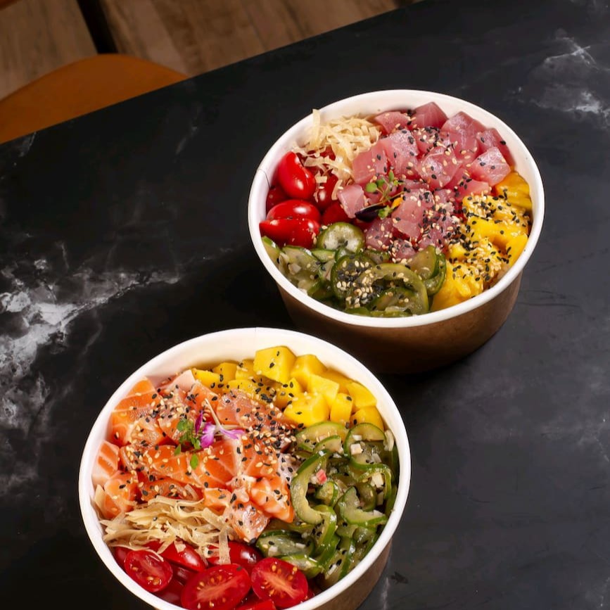 Dois pokês de salmão preparados com salmão fresco em cubos, arroz shari, manga, pepino, cebola roxa, tomate cereja, gergelim e molho especial da casa. Uma combinação equilibrada, fresca e muito saborosa. Ideal para compartilhar ou para quem quer uma refeição completa.