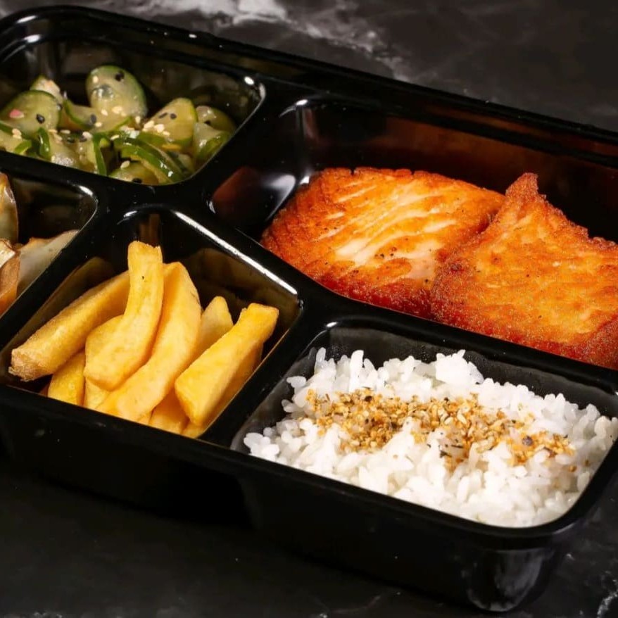 Proteína crocante, servida com arroz japonês ,legumes frescos, sunomono e batata frita.