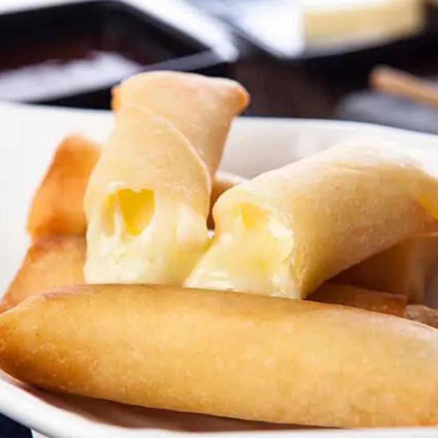 Rolinho crocante recheado com queijo derretido.