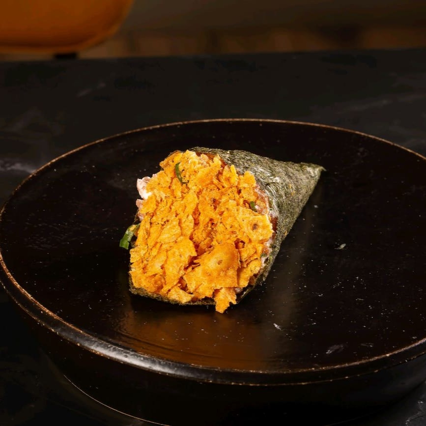 Temaki de salmão fresco com Doritos, acompanhado de arroz shari, cream cheese e cebolinha. Crocante, cremoso e muito saboroso.