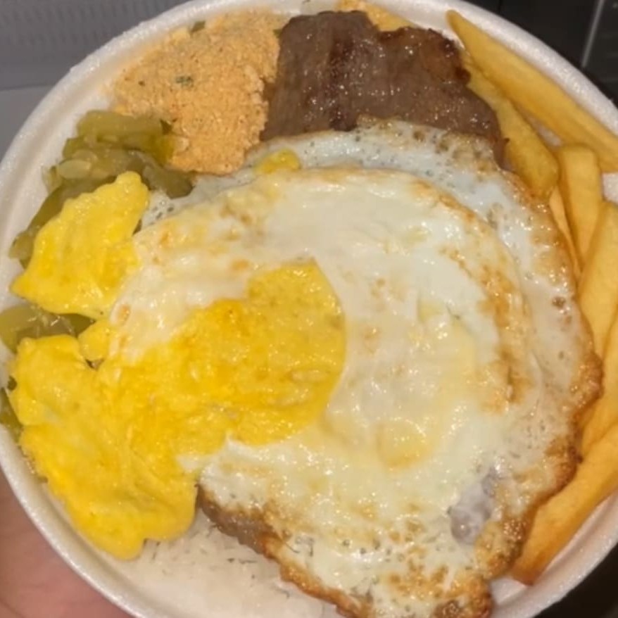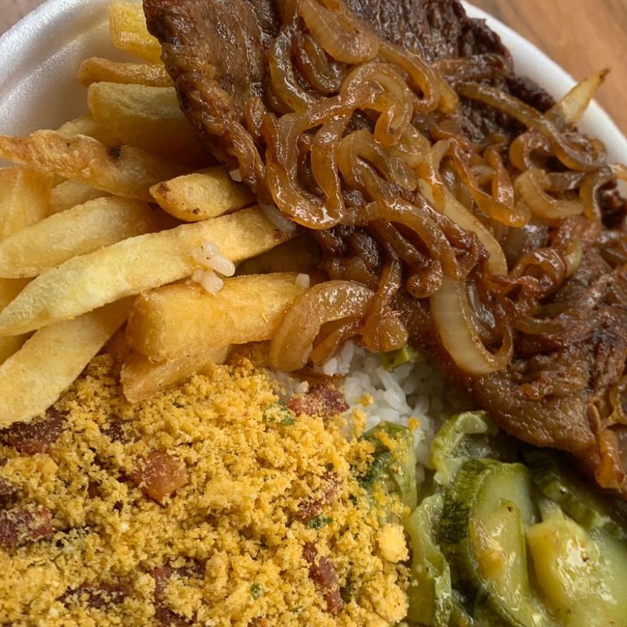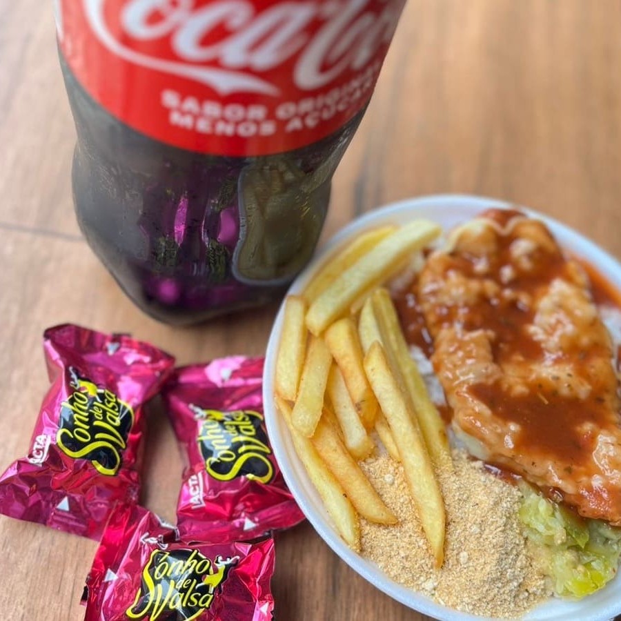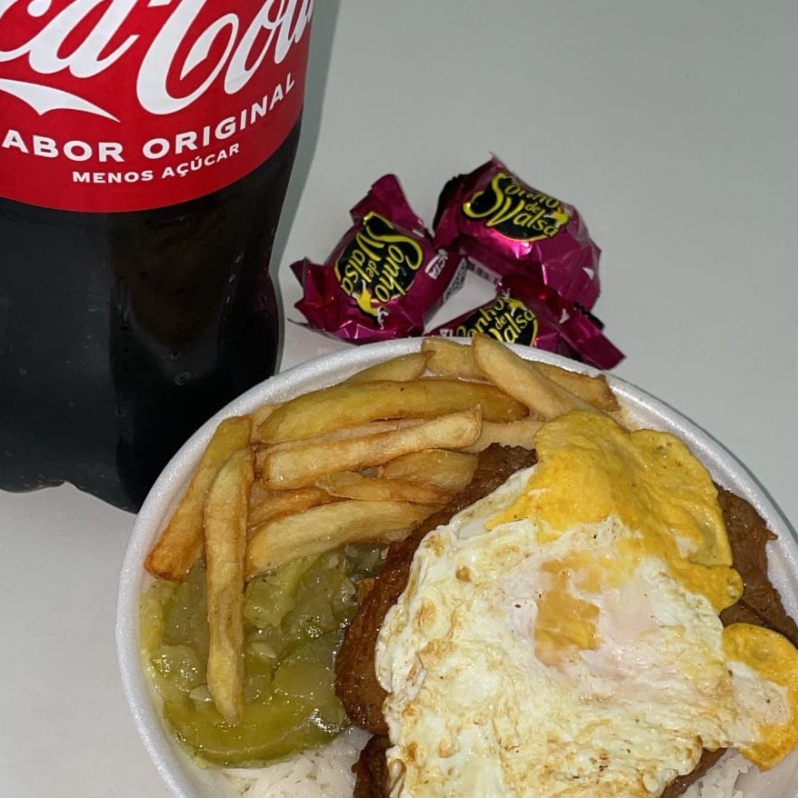 Aquela refeição mais pedida da casa ! Famoso bife a cavalo do campeão. Bife suculento com ovo frito por cima servido com arroz soltinho, feijão caseiro, farofa crocante, legumes fresquinhos do Dia. E o melhor fritas grátis !!