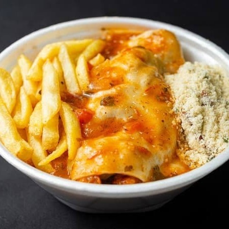 Aquela clássica !! Parmegiana de frango crocante por fora e suculenta por dentro, queijo que derrete na boca, por cima aquele molho de tomate caseiro. Acompanhado por arroz soltinho, feijão quentinho, farofa temperada, legumes fresquinho do Dia. E fritas grátis !!