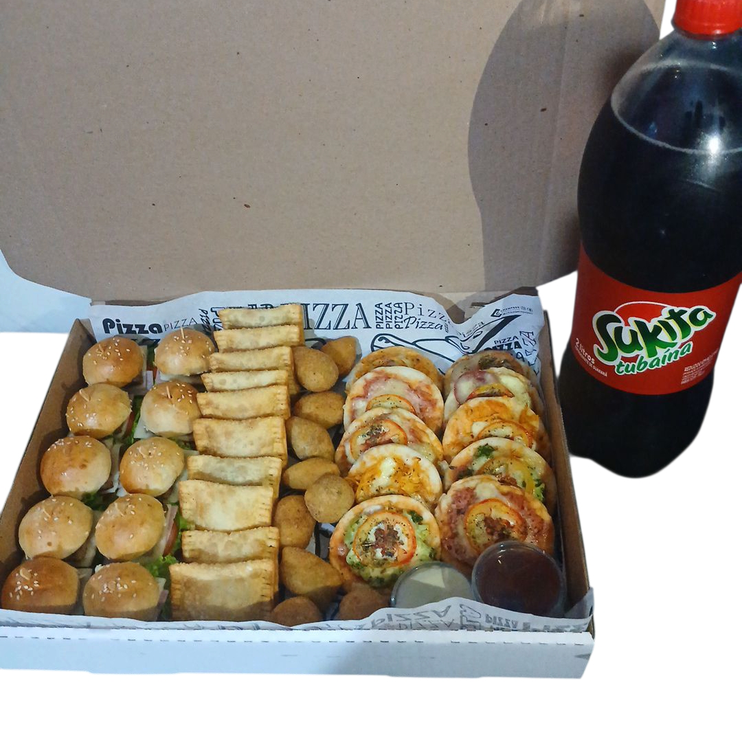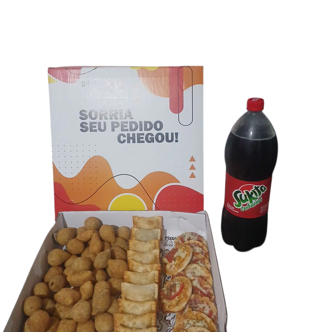 10 Salgados Fritos + 10 Mini Pastéis + 10 Mini Pizzas + 10 Mini Lanches + 01 Refrigerante 2 Litros
