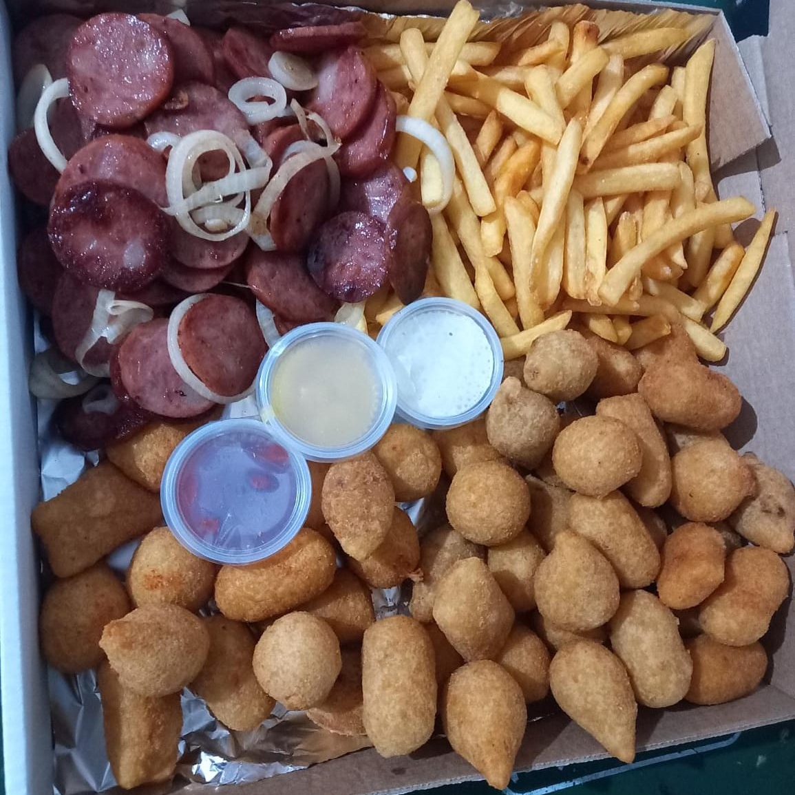 50 Salgados Fritos + Calabresa Acebolada + Batata Frita + Refrigerante 2 Litros