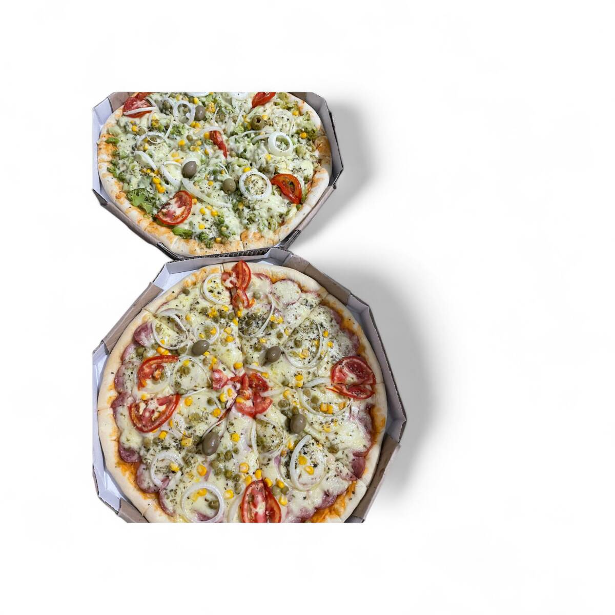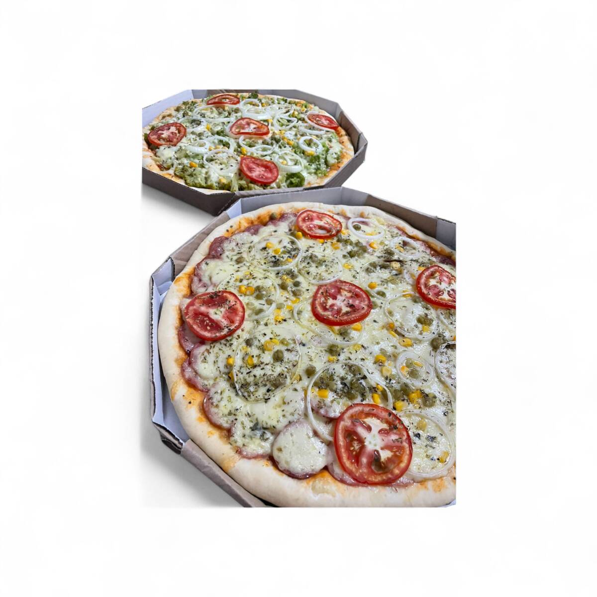 Molho de tomate, Brócolis, queijo, ervilha, milho, cebola, tomate e orégano