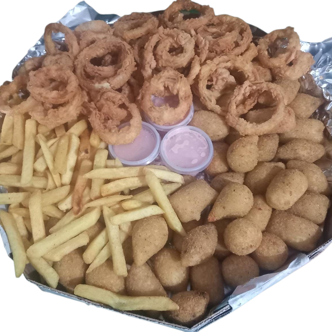 25 Salgados Fritos + Batata Frita + Anéis De Cebola Empanada + Refrigerante 2 Litros