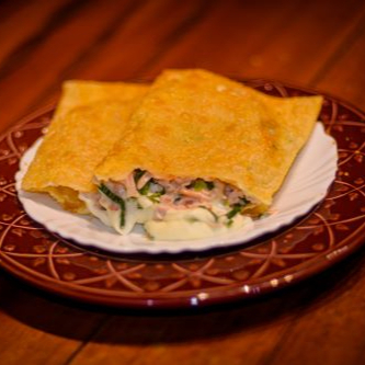 (Peito de peru, alho poró, requeijão cremoso e muçarela)