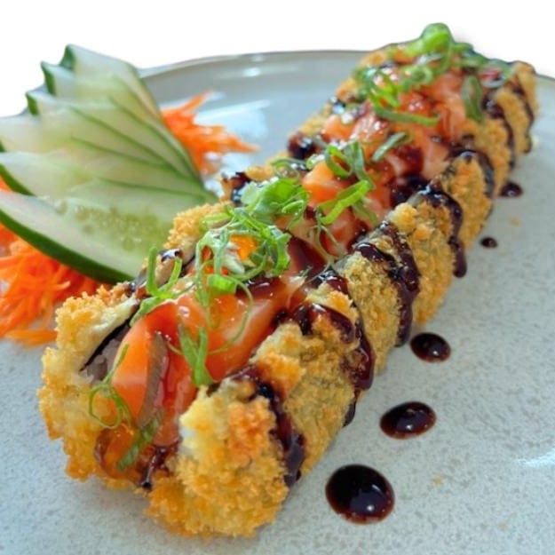 Enrolado empanado e frito. Feito com alga, arroz, salmão e cream cheese. (10 unidades)