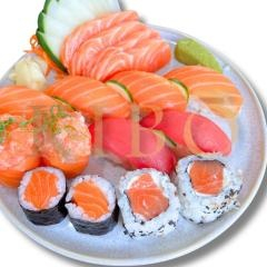Este combinado 'Japanese Premium 26 Peças' é uma sinfonia de sabores. Apresenta 2 niguiris de salmão maçaricado com manteiga trufada, delicadamente polvilhados com flor de sal, gergelim e cebolinha. Oferece também 2 niguiris de atum, preparados com uma salsa trufada primorosamente aromática. Acrescenta 2 niguiris de peixe branco maçaricado, finalizados com azeite trufado, raspas de limão siciliano e gergelim. Acompanha 2 niguiris skin com salsa trufada, 2 jôs de salmão maçaricado com queijo brie, lascas de amêndoas torradas, mel trufado e cebolinha. Inclui 2 porções de cremosinho, uma trouxinha de salmão maçaricado e caramelizado. Oferece ainda 8 peças de hot roll especial, com camarão, salmão, cream cheese, coberto com batidinho de cream cheese, cebola roxa, kani e salmão. Finaliza com 6 sashimis de salmão maçaricados, trufados e com salsa trufada. Uma experiência gourmet inesquecível.