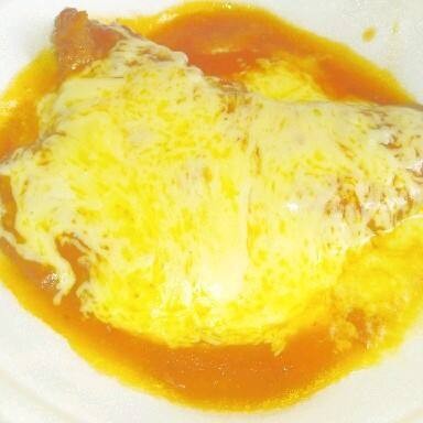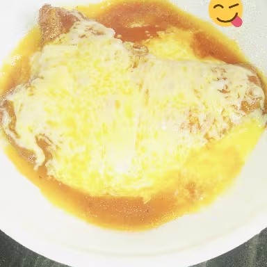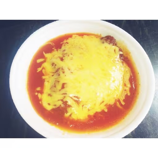 Bife de contra filé ao molho vermelho c/muito queijo derretido por cima.