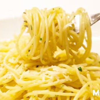 Macarrão alho e oléo com mussarela derretida por cima.