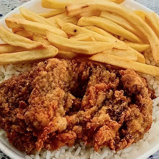 O almoço acompanha, Arroz branco, feijão carioca, batata frita e 1 bife empanado.