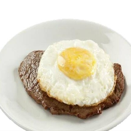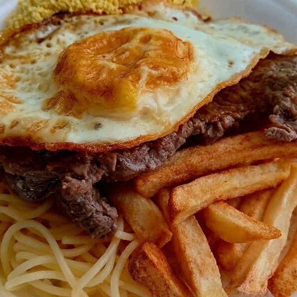 Acompanha Arroz branco,feijão carioca, batata frita, Farofa e 1 Bife c/ovo por cima.