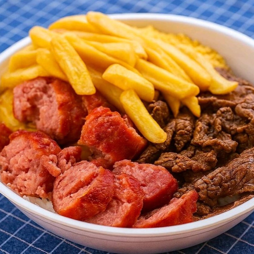 A refeição acompanha, Arroz branco, feijão carioca, batata frita, Linguiça Toscana e bife fatiado em tiras !!!