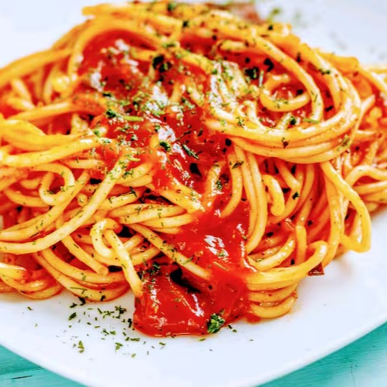 Espaguete produzido diariamente, coberto com molho vermelho.