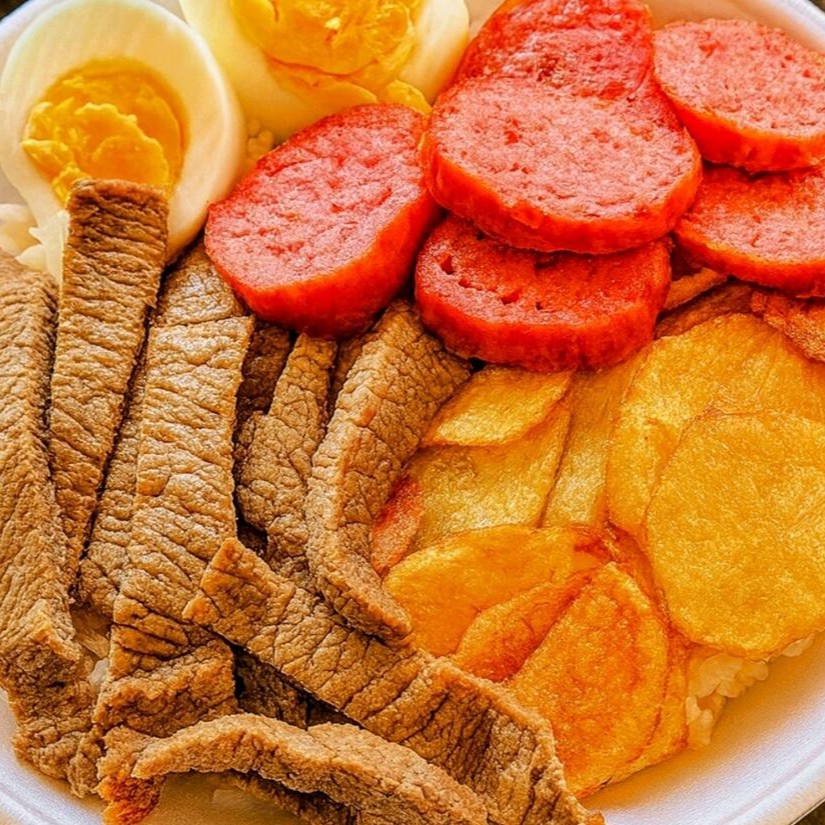 A refeição Acompanha, Arroz branco,feijão carioca, Batata frita e 2 ovo frito.