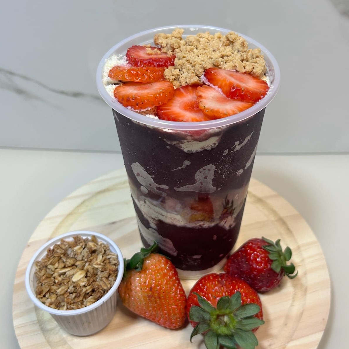 Açaí cremoso misturado com suco de laranja natural e 20g de proteína