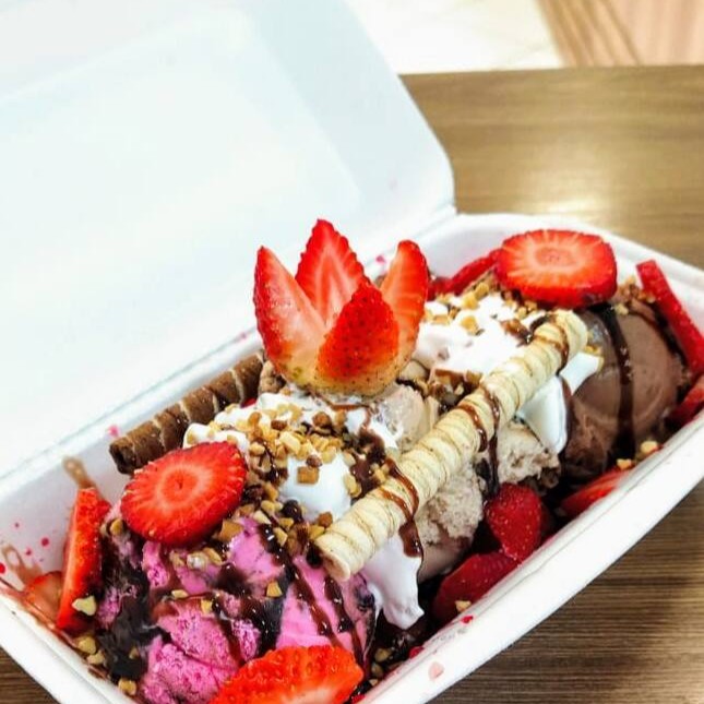 Morango, 03 bolas de sorvete, cobertura, castanha, chantilly e 2 canudos wafer.