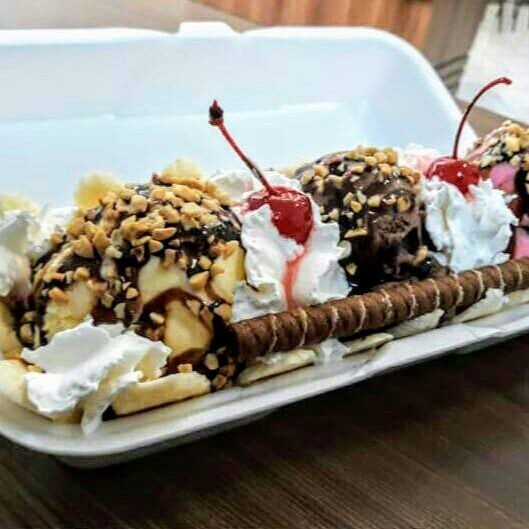 Banana, 3 bolas de sorvete, cobertura, castanha, 02 canudos wafer, chantilly, 02 cerejas.
