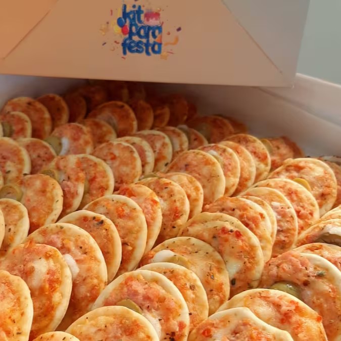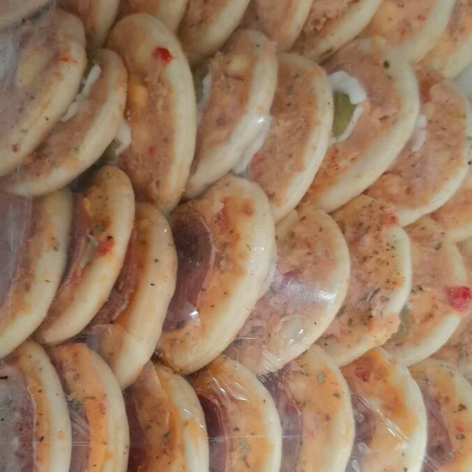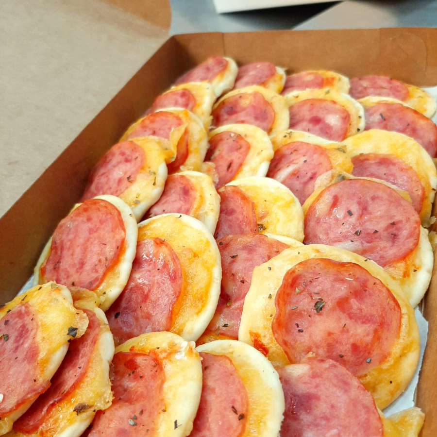 25 unidades (aprox. 20g cada), recheados com presunto, mussarela, tomate, cebola e orégano...
