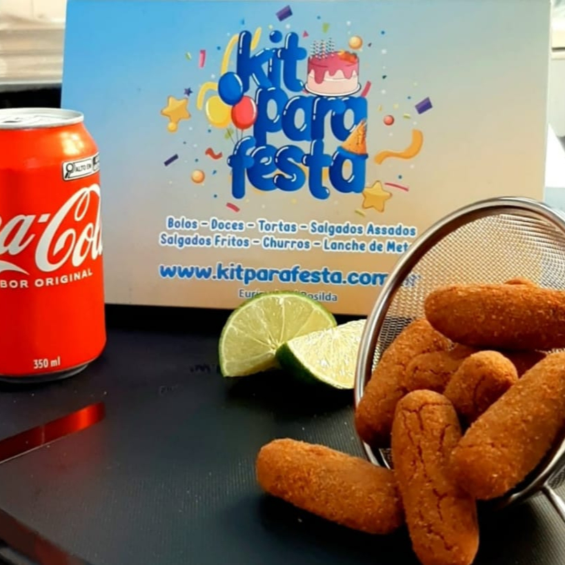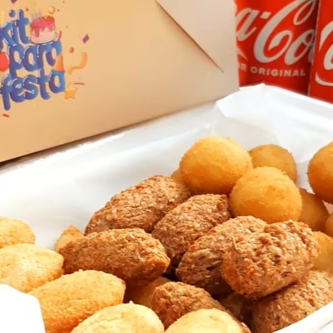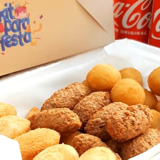 10 bolinho de requeijão, 10 kibe, 10 pastel de carne e 2 Coca-Cola lata 350 ml.