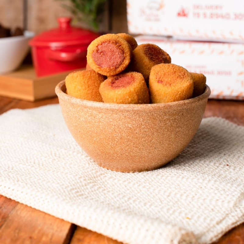 12 Coxinhas de frango, 12 Bolinhas de queijo, 12 Enroladinhos presunto e queijo, 12 Salsichas empanadas