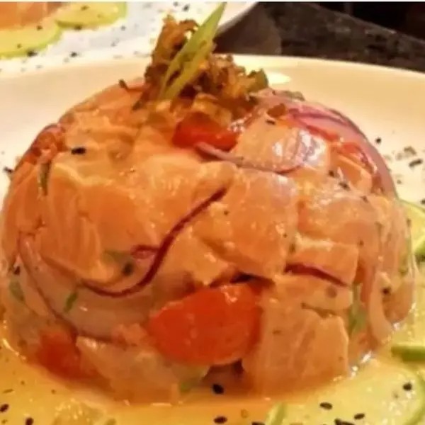 (salmão, cebola roxa, tomatinho cereja, cebolinha, gergilim e limão)