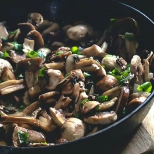(Deliciosos cogumelos salteados na manteiga com cebolinha.)