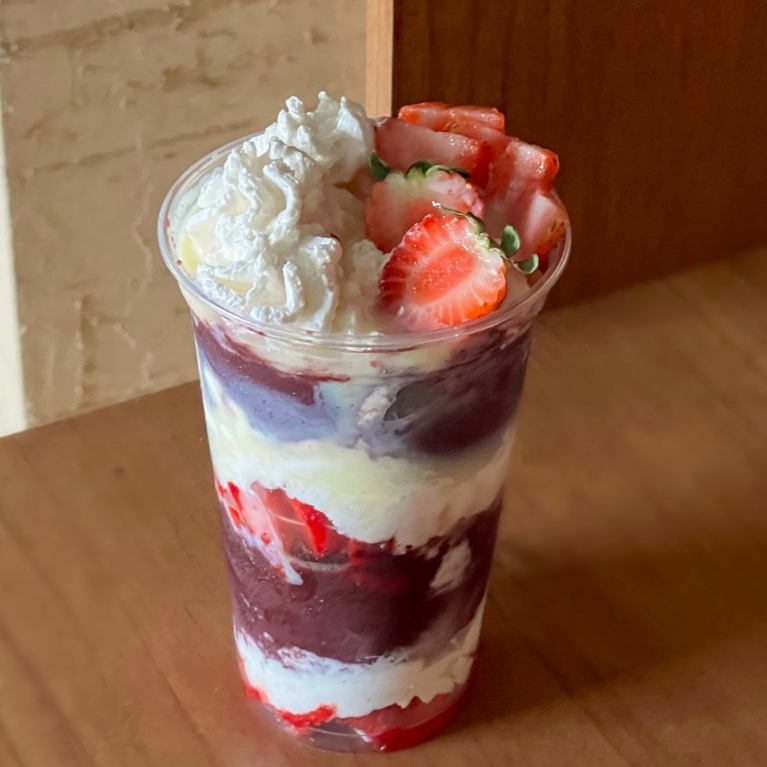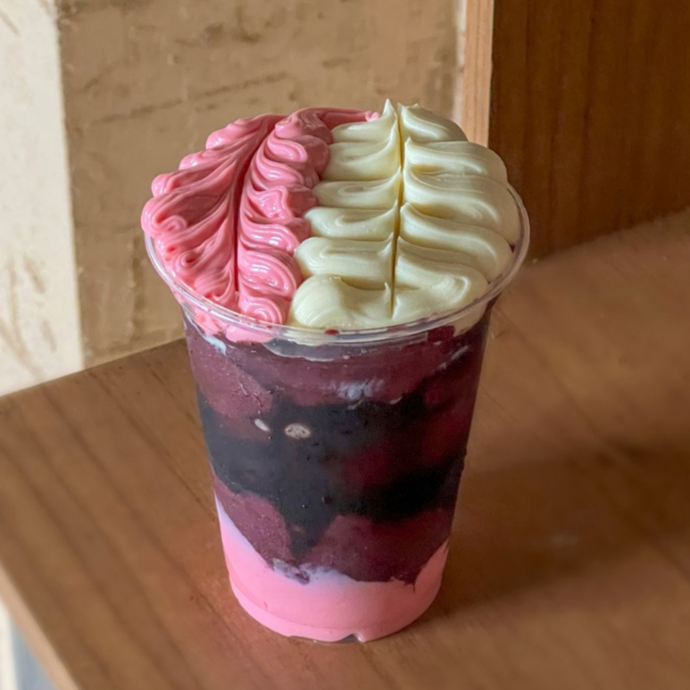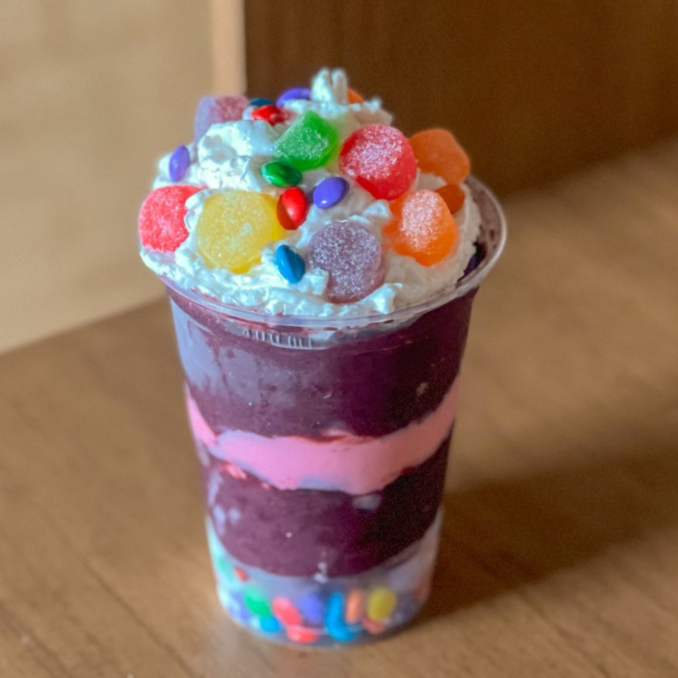 m copo cheio de cor, diversão e muito sabor! Açaí cremoso combinado com creme de morango, finalizado com chantilly fofinho, leite condensado, jujuba e confetti crocante. Doce, alegre e perfeito para os pequenos (e para os adultos que amam um toque divertido