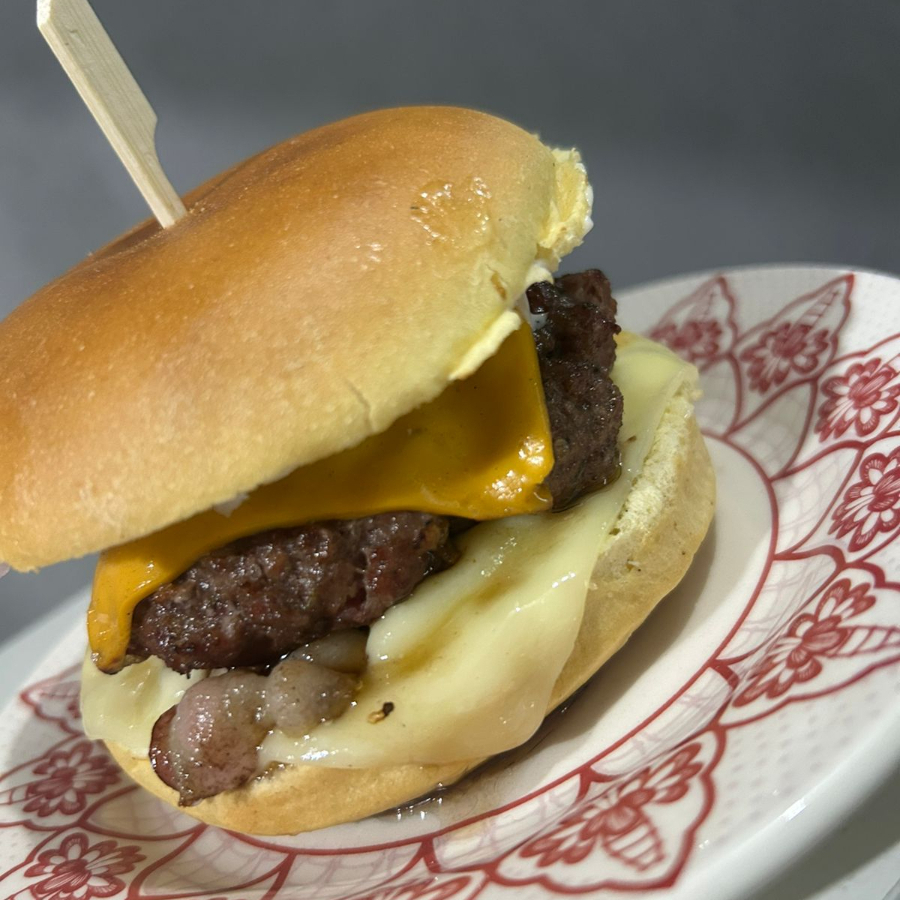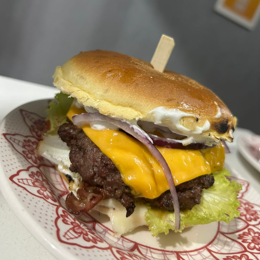 PÃO BRIOCHE, HAMBURGUER ARTESANAL 150G, BACON, MUSSARELA,CHEDDER, CEBOLA ROXA E MOLHOS