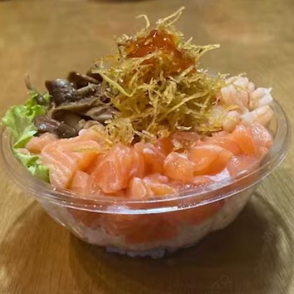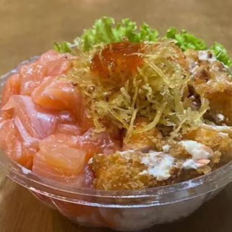 A base de arroz,creem cheese e alho frito. Alface,salmão cru,camarão cozido,shimeje,crispe de batata doce e geleia de pimenta