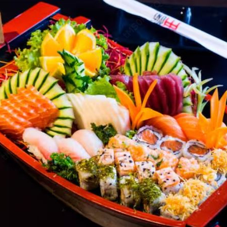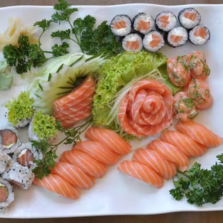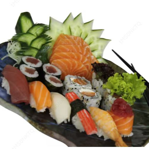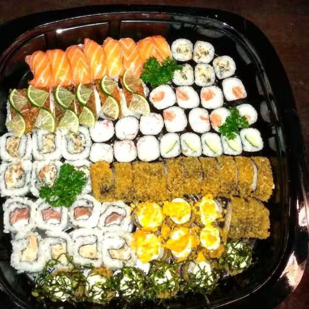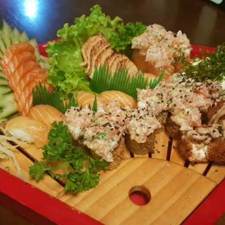 10 sashimis mistos, niguiri, 2 atum, 2 salmão, 2 peixe branco, 2 kani, 2 camarão, 4 gunka shakê, 8 uramakis e 9 hossomakis
