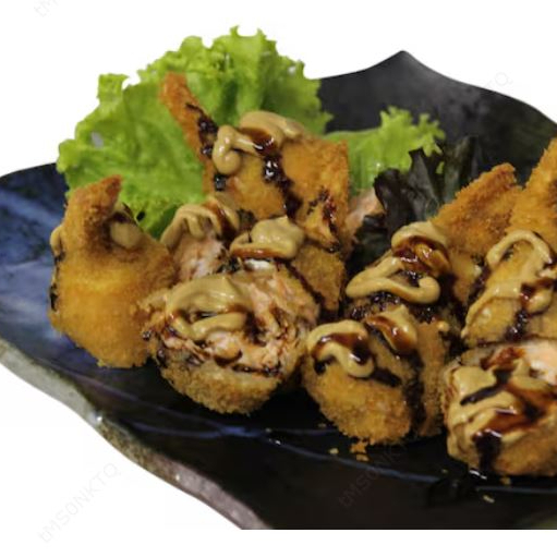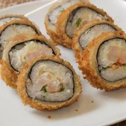 6 un - Sushi empanado com recheio de salmão, camarão, cream cheese, servido com molho teriyaki, cebolinha e gergelim. Foto ilustrativa