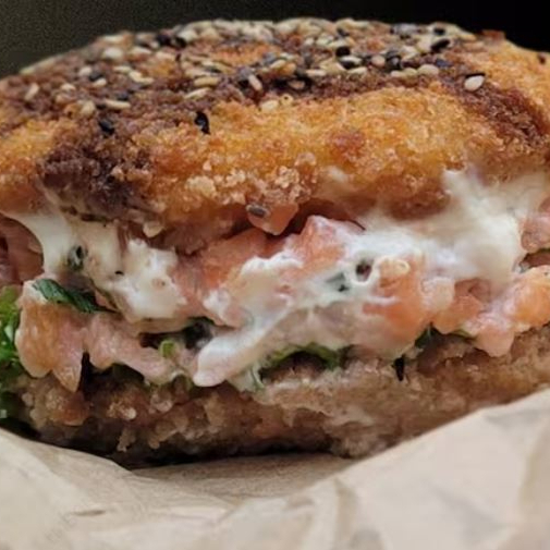 Arroz empanado e salmão cru ou grelhado com cream cheese.