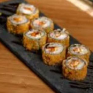 6 un - enrolado de arroz com recheio empanado a base de kani, cream cheese e salmão