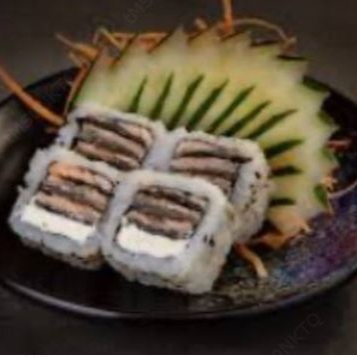 6 un - sushi empanado com recheio de salmão, cream cheese, servido com molho teriyaki, cebolinha e gergelim. Foto ilustrativa
