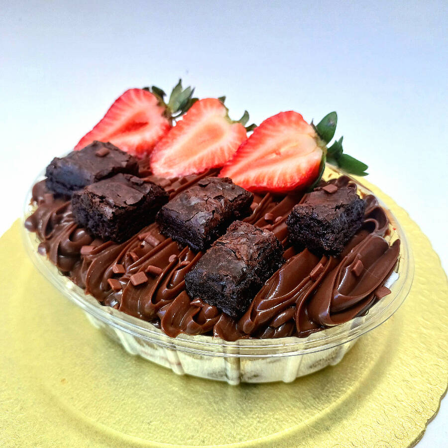 Deliciosa combinação entre brigadeiros cremosos,mousse de Ninho,brownie chocolatudo e morangos frescos.Travessa pequena,serve em média 4 porções.
