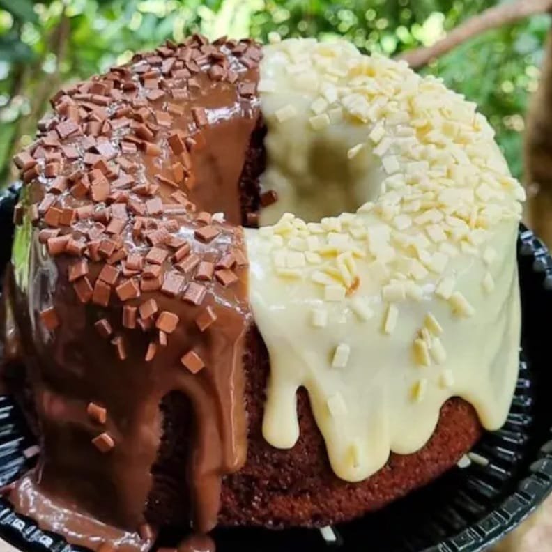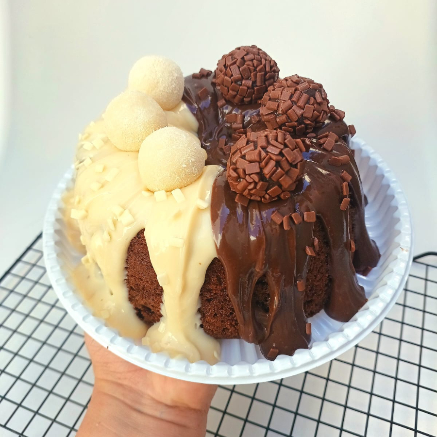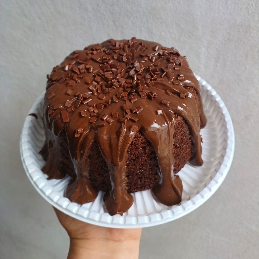 Delioso bolo caseiro com massa fofinha de Cacau 50% com cobertura de brigadeiro de Cacau ,finalizado com granulados de chocolate nobre. Perfeito para saborear com um cafezinho ou uma Coca geladinha ; ) *serve média 6 porçoes *forma 16cm